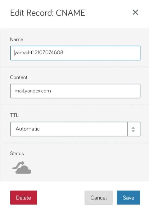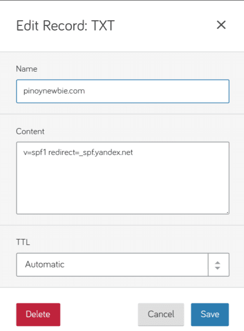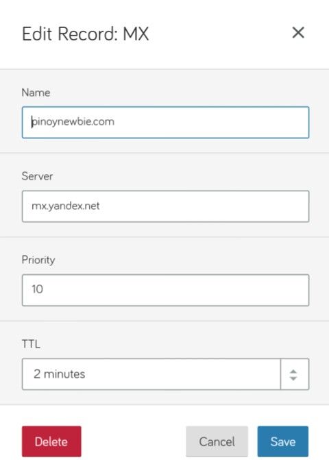 name: @ (you can also use your naked domain eg. pinoynewbie.com) Type of record: MX Priority: 10 Server/Host: mx.yandex.net