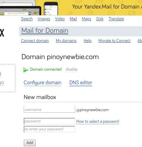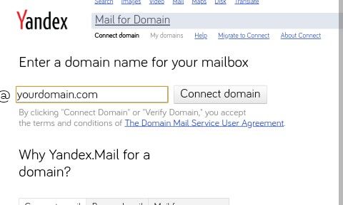 For you to be able to use Yandex Mail [for domains], you must connect your domain name to their service. To add your domain simply put your website address on the textbox and click “Connect Domain”.
